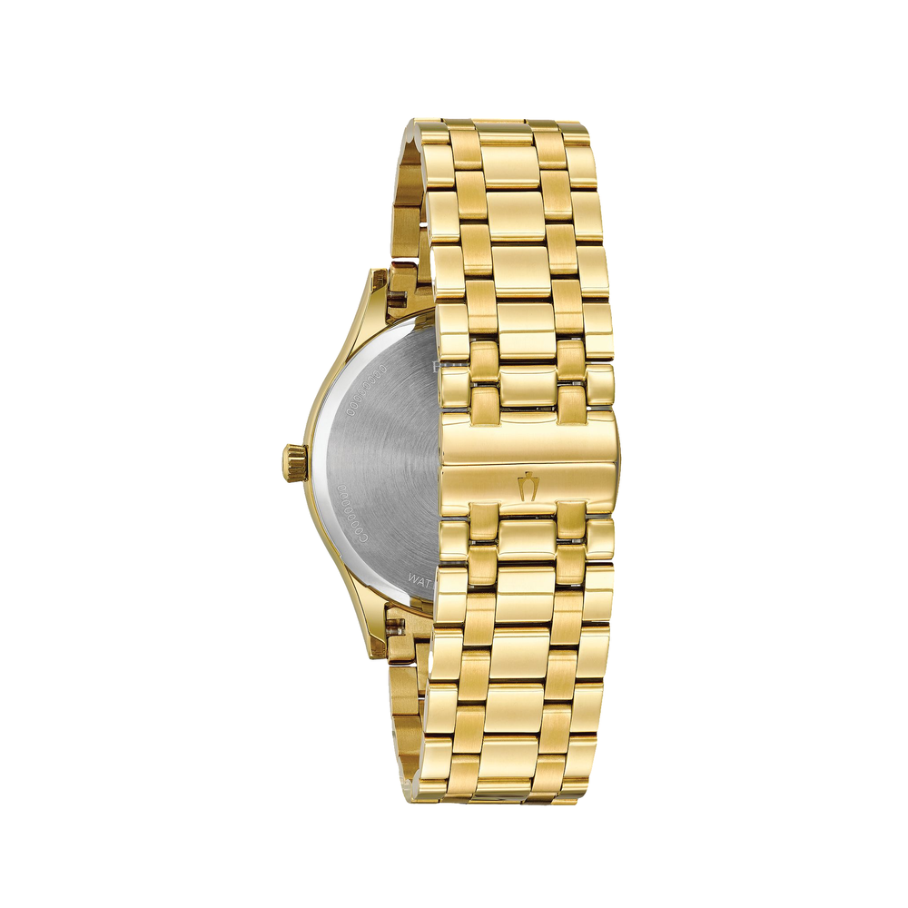 From the Diamonds Collection. New 8-diamond black dial, gold-tone stainless steel case and bracelet with double-press deployment closure, three-hand calendar, and flat mineral glass.