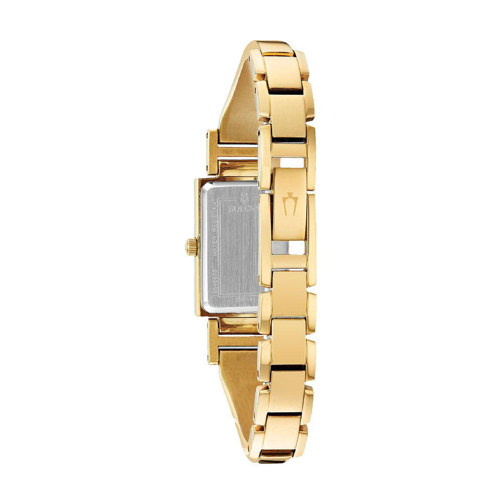 Classic style with stainless steel gold tone case and bangle with a white mother of pearl dial set with three diamonds. Watches features a flat mineral crystal, quartz movement, and water resistance to 30 meters.
