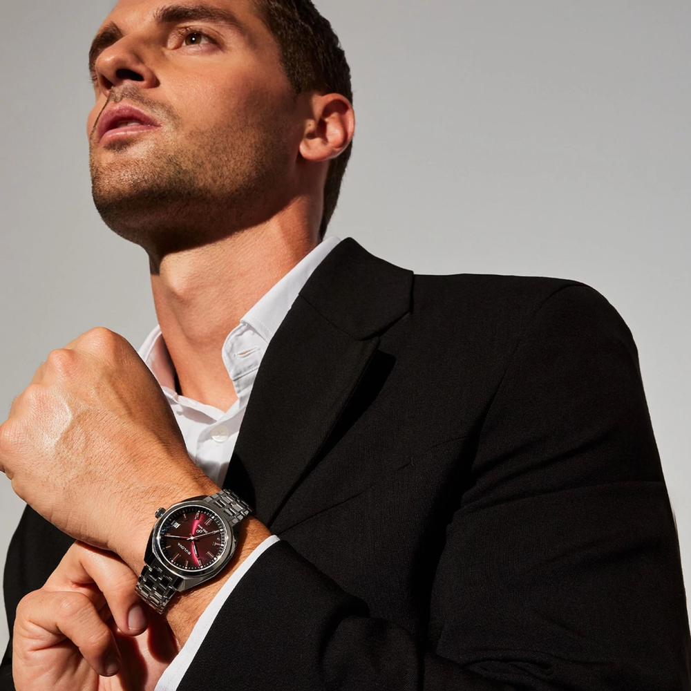 Straight from the 1970s comes the Bulova 1973 Jet Star, an iconic model from the brands impressive history, now equipped with an equally impressive movement. Borrowing from its historic forebear, the stainless steel case features a striking angular design with broad facets and a domed sapphire crystal. The magnificently claret sunburst dial is accented by a black chapter ring, applied black and red hour markers, and matching silver tone and red hands. Luminescent plots at each hour and fill in the hands allow for exceptional legibility in every environment, while a date display sits perfectly at 3 o’clock. The new Jet Star is powered by Bulova’s Precisionist movement, a revolutionary 8-jewel quartz mechanism vibrating at a remarkable 262kHz, accurate to 5 seconds per month with increased resistance to temperature changes, and with a sweeping seconds hand. Complementing the stainless steel case is a matching bracelet with a deployant clasp closure and latched spring bars for easy release. Strut your stuff in legendary style with the high-flying Bulova 1973 Jet Star, a legendary design recreated for the modern connoisseur.