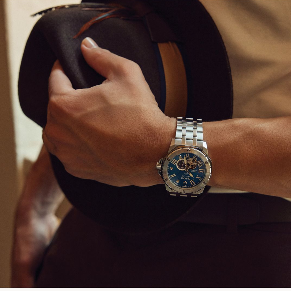 Capturing the daring style of Marc Anthony, one of music’s most influential artists, Bulova presents the all-new Marc Anthony Series A. The bold, angular silver-tone stainless steel case features brushed finishing with polished accents, a silver-tone bezel with grey accents, a flat mineral crystal, and a screw-down crown. The stunningly vibrant blue dial combines sunray texture along the hour track and a central dial with a radiant sunburst finish, complete with hands with luminescent treatment, polished indices, and a grey running seconds sub-dial. The dial is further accented with diamond hour markers at 1, 3, and 5 o’clock, chosen by Marc for their personal significance. Visible through both the dial aperture and an exhibition case back, the open heartbeat automatic movement features 21 jewels and a 42-hour power reserve. The 44mm watch has 200m of water resistance and is complemented with a matching silver-tone stainless steel bracelet with a push-button deployant clasp. Uniting Marc Anthony’s iconic music with Bulova’s proprietary technology and Bold at Heart spirit, this new men’s timepiece will keep you always within style’s rhythm.