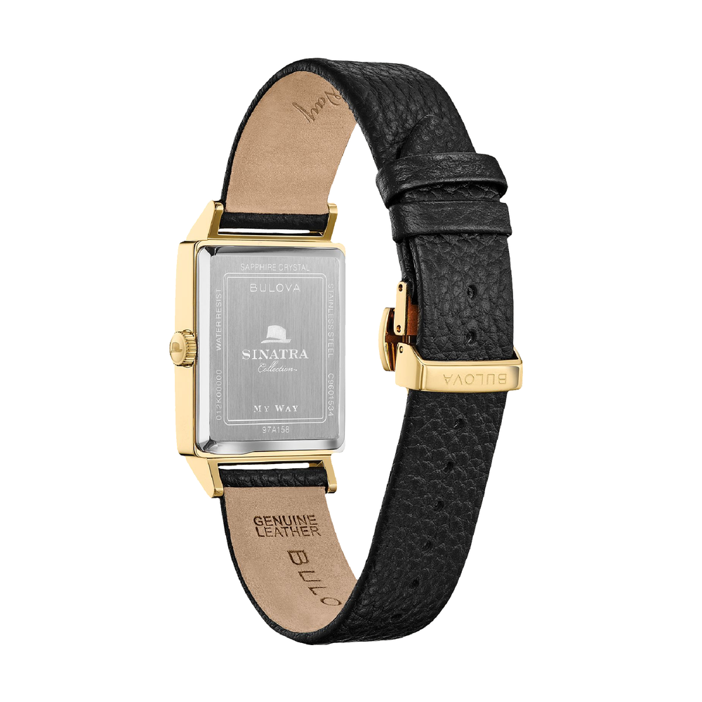 Incorporating vintage Bulova designs with the unmistakable elements of legendary performer, Frank Sinatra, the ‘My Way’ watch features a gold-tone stainless steel rectangular case with a silver white dial, gold-tone hands and markers. Frank Sinatra’s signature is displayed under the Bulova logo and his iconic Fedora hat is etched on the gold-tone crown, as well as on the caseback along with the name, ‘My Way’. A distinct second hand sub sweep adds an elegant touch. The black leather strap features a deployant buckle and is stamped with the name ‘My Way’ along the inside. Watch features a curved sapphire crystal and water resistance to 30 meters.