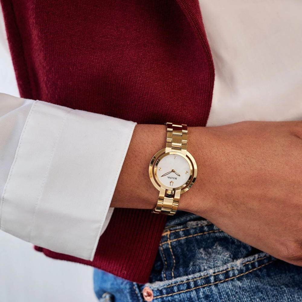 Reinventing legendary style, this Bulova women’s watch introduces a new petite model to the historic Rubaiyat collection. A synthetic blue spinel cabochon crown accents the 30mm gold-tone stainless steel case that features a sapphire crystal and a matching bracelet with a push-button deployant closure. Elegant gold-tone hands and faceted clover-shaped markers appoint the lustrous white mother-of-pearl dial. Enhance any ensemble, day or night, with this quintessentially feminine Bulova ladies’ timepiece.