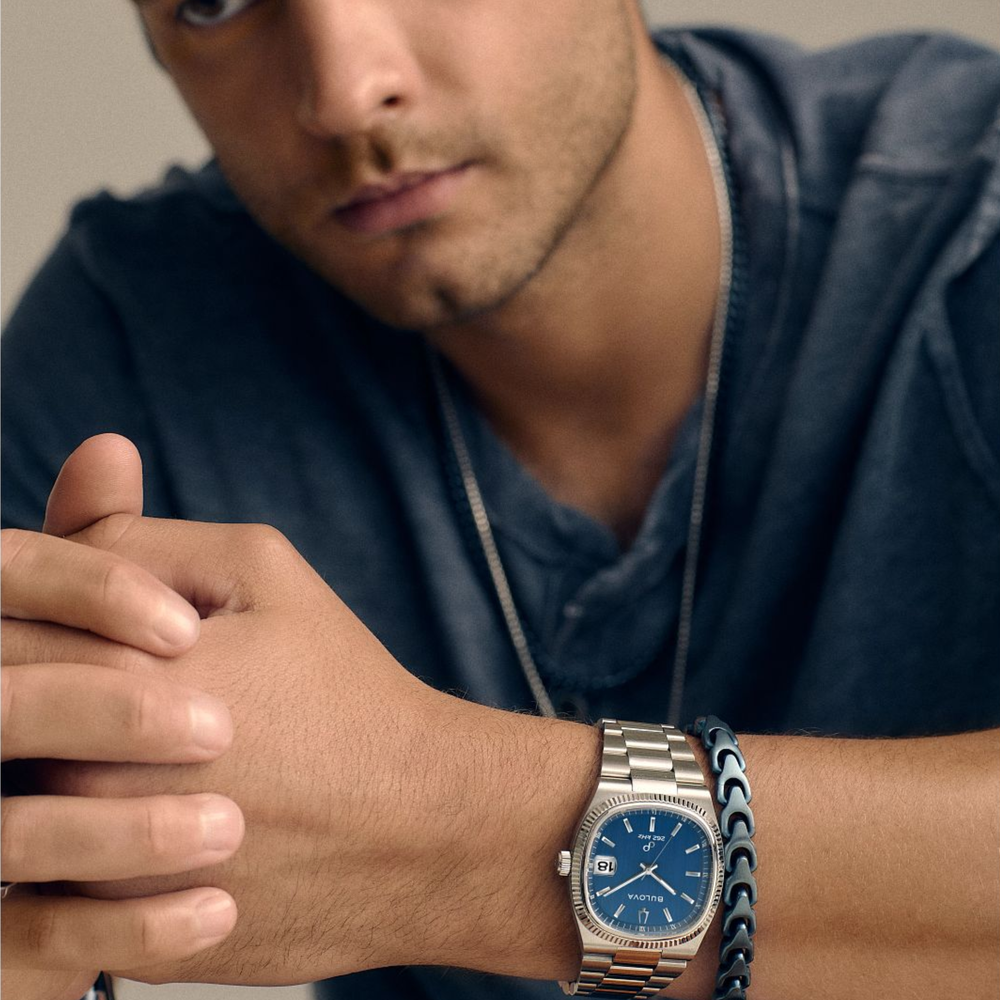Drawing inspiration from the incredible Bulova Super Seville Day-Date from the 1970s, the new Super Seville merges retro aesthetics with state-of-the-art Precisionist technology for a timeless modern appeal. The silver-tone stainless steel 38mm case has the versatility to be worn by most anyone and makes a bold statement with a seamless silhouette created by the retro TV-shaped case transitioning into the integrated 3-link stainless steel bracelet, which features a secure and convenient push-button deployant clasp. An elegant, grooved coin edge bezel enhances the case and surrounds the flat sapphire crystal and its date magnifier. The compelling dial is a deep vertical brushed blue, with polished hands and indices and a date situated perfectly at 3 o’clock. The new Bulova Super Seville is powered by our proprietary high precision quartz Precisionist movement, a revolutionary 8-jewel quartz mechanism vibrating at a remarkable 262kHz, accurate to seconds per year with increased resistance to temperature changes, and with a smooth sweeping second hand. Embrace an effortless kind of elegance with the men’s Bulova Super Seville.