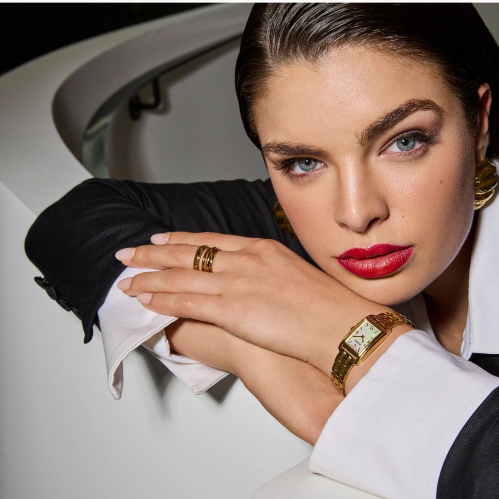 This all-new Bulova women’s timepiece brings a luxurious elegance to the already impressive Sutton Collection. The refined gold-tone stainless steel rectangular case features a mineral crystal and finishing that shines brilliantly in the light. The lustrous mother-of-pearl dial is accented with gold-tone Roman numeral markers and hands for a look of true elegance. A matching five-link gold-tone stainless steel bracelet features a deployant closure with pushers for a perfect fit and latched spring bars for easy release. This Bulova ladies’ timepiece offers an understated sense of luxury for the woman with an elevated sense of style.