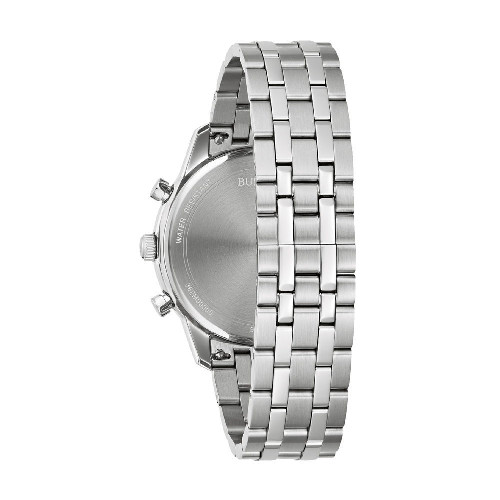 Timeless design and modern functionality define this new 6-hand Bulova men’s chronograph from the Sutton Collection. A silver-tone stainless steel case with a blend of brushing and polishing offers a sophisticated aesthetic and features classically styled chronograph pushers and a domed mineral crystal. A sleek silver-tone dial features applied black and blue hour markers against a circular grooved track, luminescent blue hour and minute hands, and a date display. The chronograph can time events up to 12 hours to the nearest second. For a seamlessly elegant look, the watch is paired with a silver-tone stainless steel multilink bracelet with a deployant closure. Elevate your wardrobe with design that never goes out of style with this new Bulova men’s chronograph timepiece from the Sutton Collection.