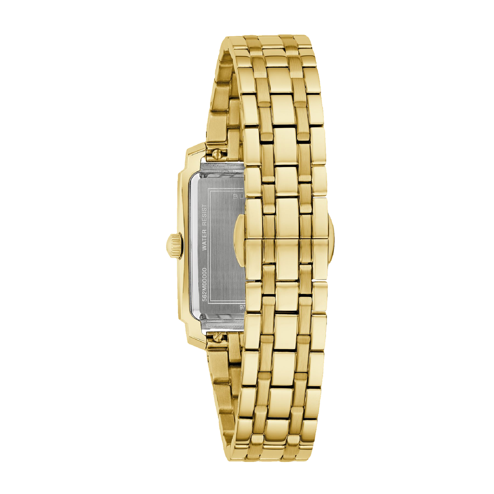Embrace a refined elegance with this impressive Bulova women’s timepiece from the Sutton collection. Distinguished by a gold-tone stainless steel rectangular case, the watch features a mineral crystal and a finishing that dazzles in the light. The brilliant white enamel dial is accented with applied gold-tone numerals and hands for a look of true sophistication. A matching five-link gold-tone stainless steel bracelet features a deployant closure with pushers for a perfect fit and latched spring bars for easy release. Experience an elevated sense of luxury with this Bulova ladies’ timepiece for the woman with an exceptional sense of style.