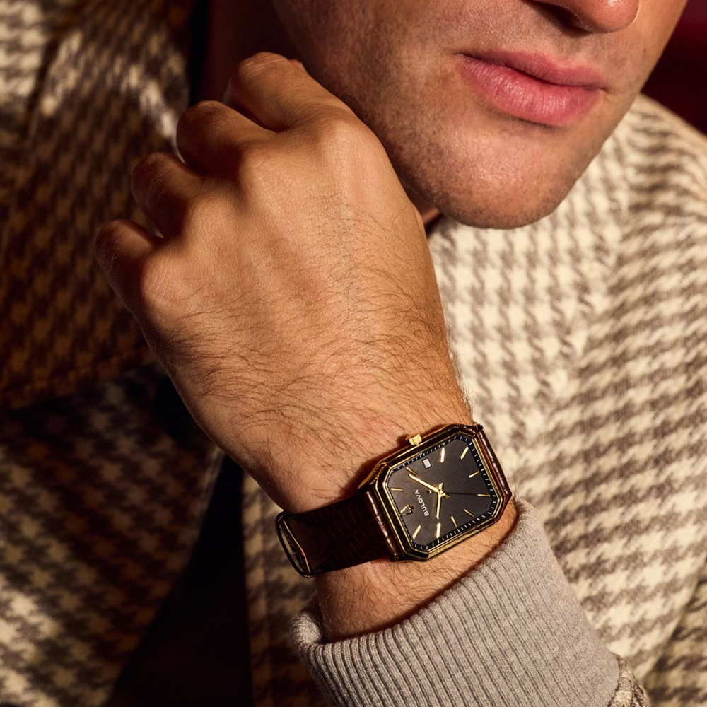 As part of a new partnership with the Tony Bennett Foundation, the “We Are All Here” Duet Bulova men’s timepiece celebrates the timelessness and incomparable talent of the memorable crooner. Taking its inspiration from the classic design of the 1980s, when Bennett staged a roaring comeback, the watch’s gold-tone stainless steel case has a sleek, angular silhouette with polished faceting, paired with a brown embossed Teju lizard leather strap. Accented with gold-tone hands and markers, the vertically brushed black dial is a study in perfection, with a seconds hand counterbalance shaped like Bennett’s signature folded pocket square. With Tony Bennett’s signature gracing the case back, this Bulova men’s watch pays tribute to one of the greatest performers of all time.