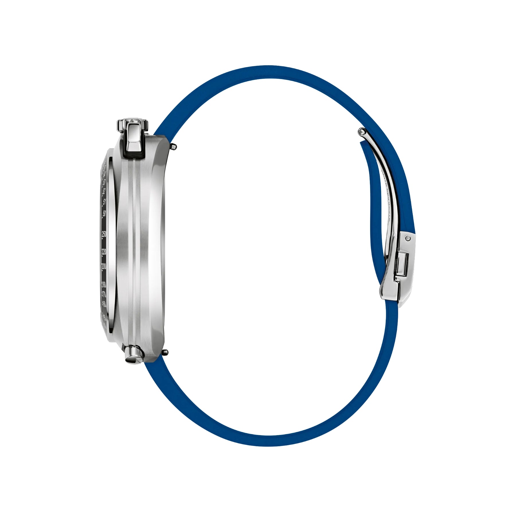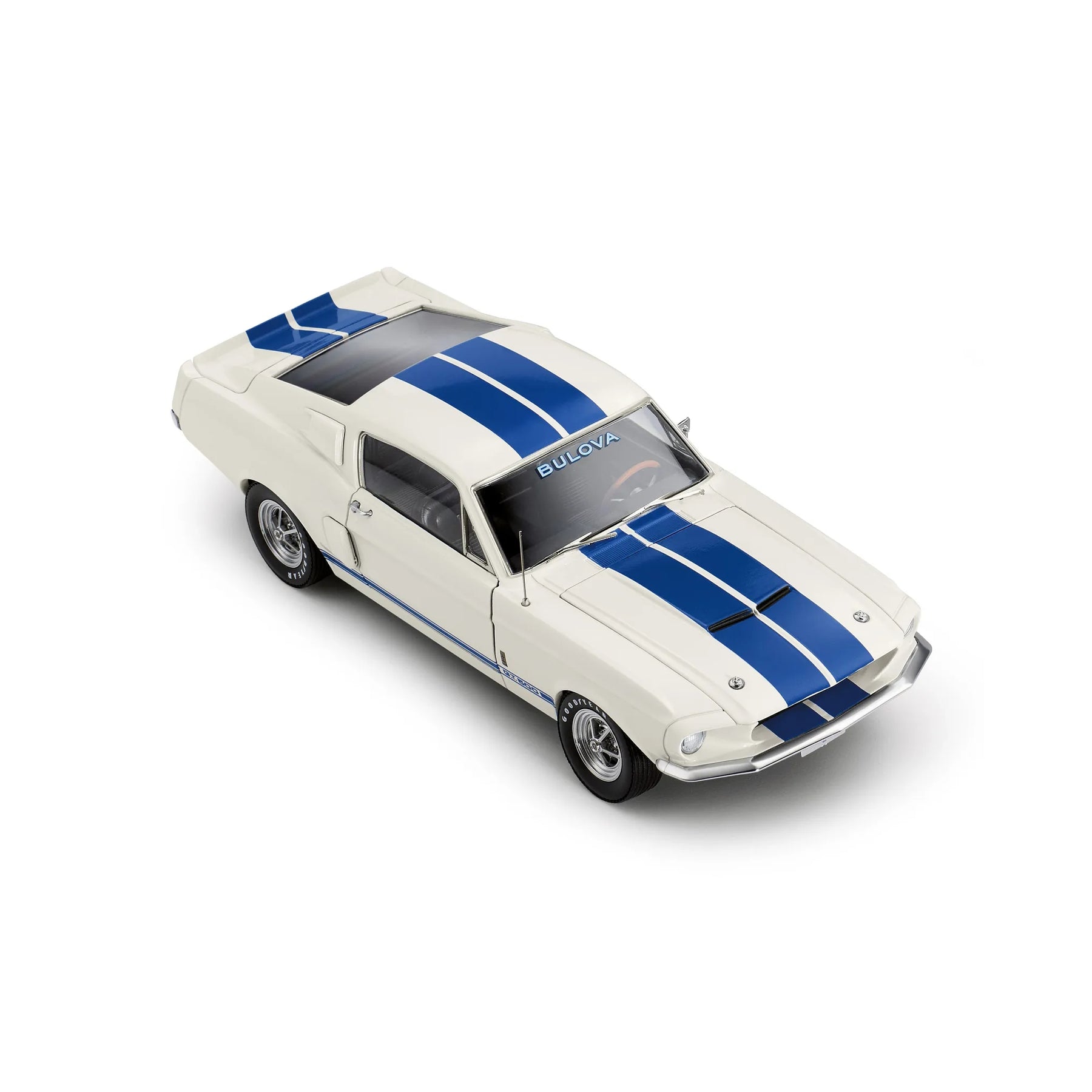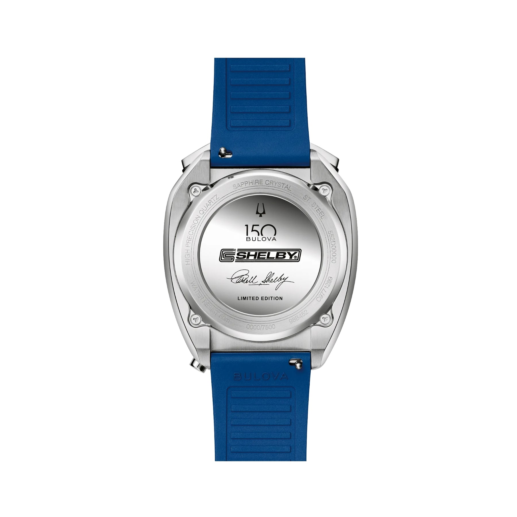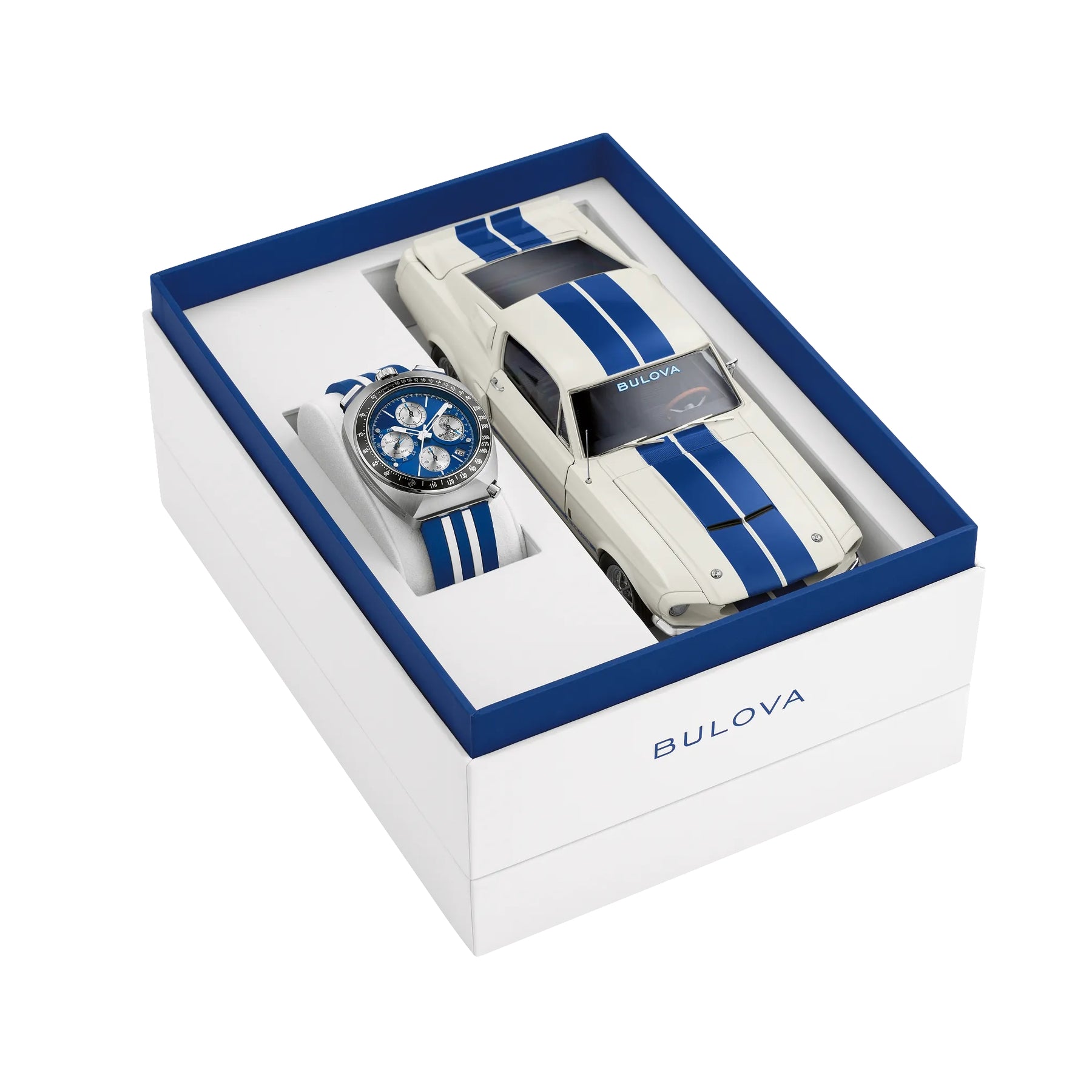 Experience the thrill of speed, right on your wrist. As part of a new collaboration for Bulova’s 150th Anniversary, the new limited-edition Bulova Racing Chronograph combines legendary muscle car customizer Carroll Shelby’s trailblazing racing style with Bulova’s innovative watchmaking technology. Shelby’s signature blue and white colorway is on full display, striping the rubber strap, accenting the dial, and elevating the 43mm silver-tone stainless steel case. Inspired by the massive power of the 1967 Shelby Ford Mustang GT500, the angular bullhead case offers a dramatic presence on the wrist, recalling the aerodynamic lines of that iconic car and including a black tachymeter ring, sapphire crystal, 12 o’clock crown and pushers, and a grooved mid-case echoing the car’s racing stripes. With the Shelby Cobra logo nestled in the 3 o’clock register, the dial roars to life with 8-hand chronograph functionality including timing to an astonishing 1/1000 second, powered by Bulova’s proprietary high precision quartz Precisionist movement , resonating at a frequency of 262khz for unparalleled accuracy and allowing a sweeping chronograph hand. With an individually numbered polished case back bearing Shelby’s signature and delivered in a limited-edition box with a 1:24 die-cast model of the GT500, the new Racing Chronograph brings the power of Shelby’s creations to your wrist for unparalleled style. Limited to 7,500 pieces worldwide.