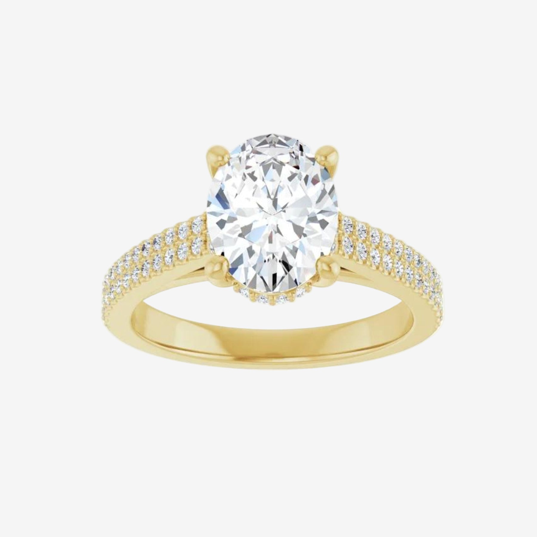 Engagement ring in gold featuring an oval lab-grown diamond, enhanced by a delicate row of small diamonds along the ban a perfect balance of brilliance and timeless elegance.